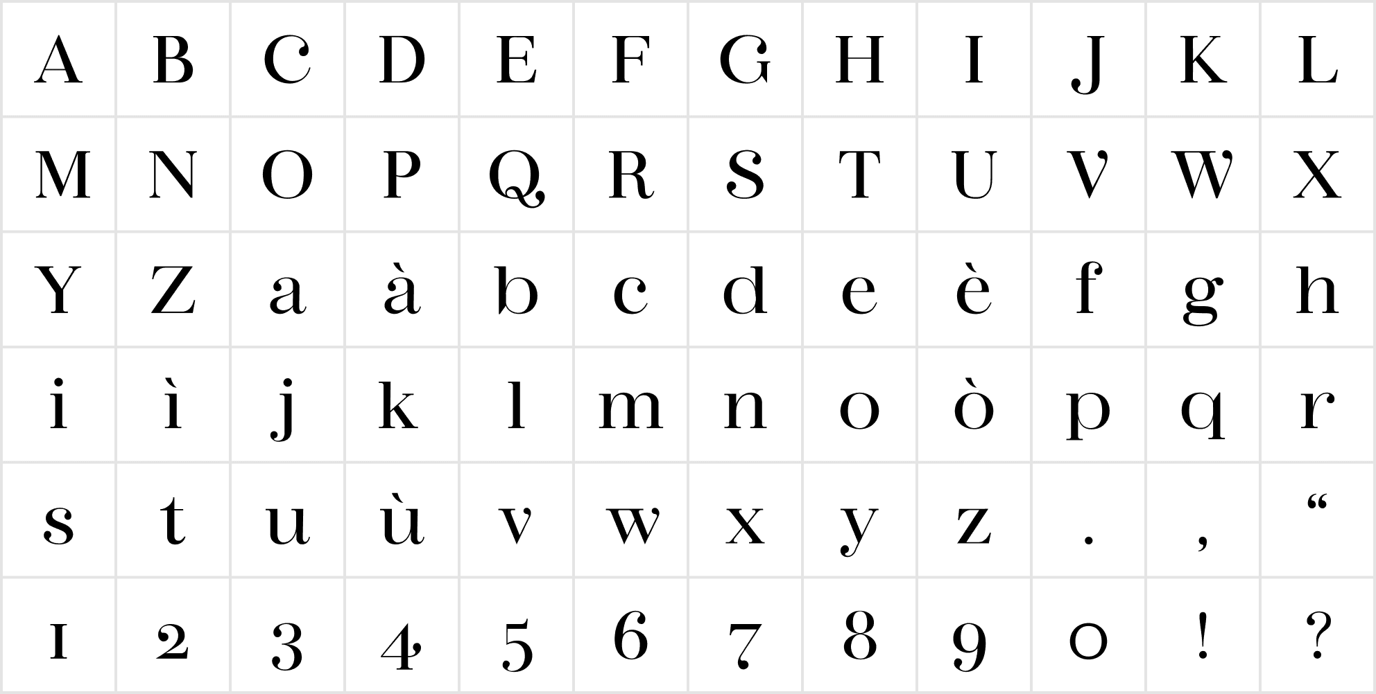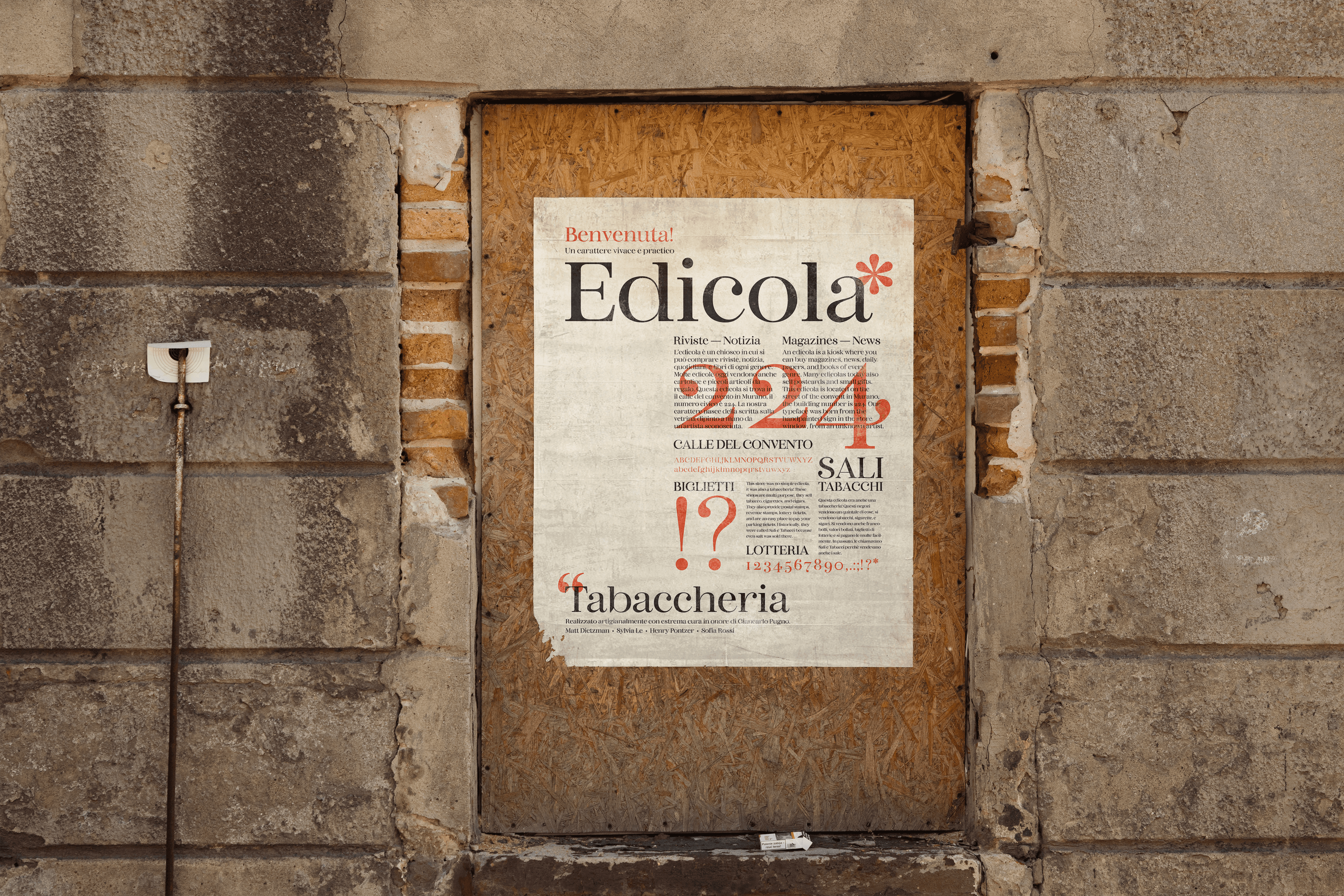The typeface was modeled after a photographed sign for a combination tabaccheria and edicola, ubiquitous Italian shops that sell tobacco, postage stamps, newspapers, sweets, and more.
